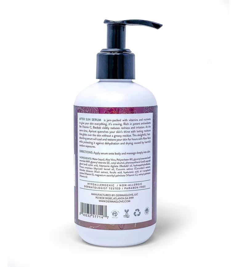 Developed in 2015 as part of DERMAGLOVE’s original body serum line, After Sun Body Serum was created with the understanding that sun-exposed skin has unique recovery needs. This lightweight, fast-absorbing serum delivers targeted hydration and soothing support to help calm stressed skin and restore moisture balance. Designed for use after time outdoors, this serum helps replenish hydration while supporting the skin’s natural barrier following environmental exposure. Its breathable texture absorbs quickly without heaviness, leaving skin feeling refreshed, comfortable, and nourished. After Sun Body Serum reflects DERMAGLOVE’s early philosophy that body care should be functional, adaptable, and responsive—supporting the skin exactly when it needs it most.