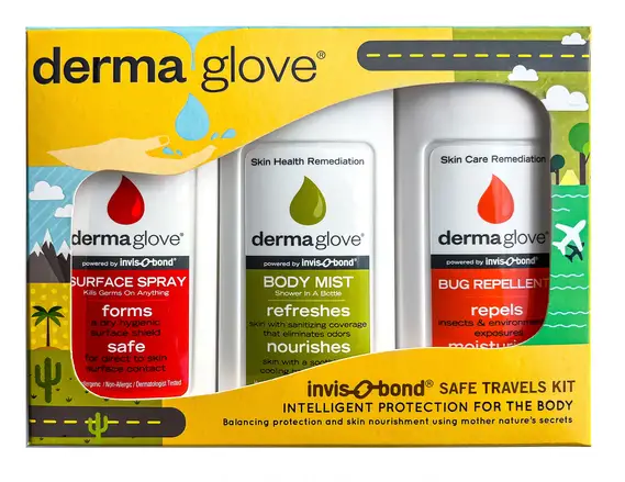 The DERMAGLOVE Safe Travels Kit is your 3-piece, TSA-friendly hygiene companion for airport days, hotel stays, road trips, and busy travel schedules. Travel can dry out skin and increase contact with unknown surfaces—this set helps you stay clean, balanced, and comfortable without chemical-heavy products. Powered by INVIS-O-BOND Technology, DERMAGLOVE formulas are designed to support a breathable protective barrier while keeping skin feeling hydrated and refreshed. Keep it in your carry-on, purse, glove box, or gym bag so every trip feels cleaner, calmer, and more confident.