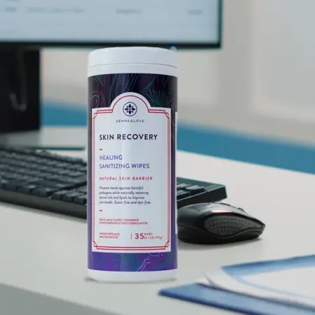 SKIN RECOVERY Wipes are alcohol-infused hygienic wipes designed for skin and surfaces that eliminate 99.9% of bacteria while replenishing natural oils, lipids, and moisture—restoring skin health without harsh residue, fragrance, or dyes.